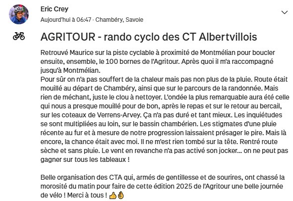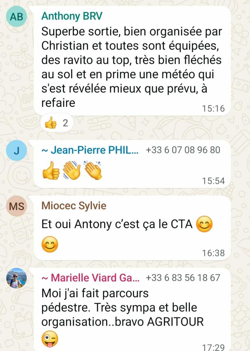 Nous l’avons fait ! Les conditions météo n’ont pas facilité l’organisation du 24ème Agritour mais l’essentiel a été préservé. Agritour a réuni plus de 200 participants ce qui justifie le fait d’avoir tenu le cap. Une fois encore les retours des participants sont très positifs : accueil, parcours, ambiance, ravitaillements, fléchage, repas…