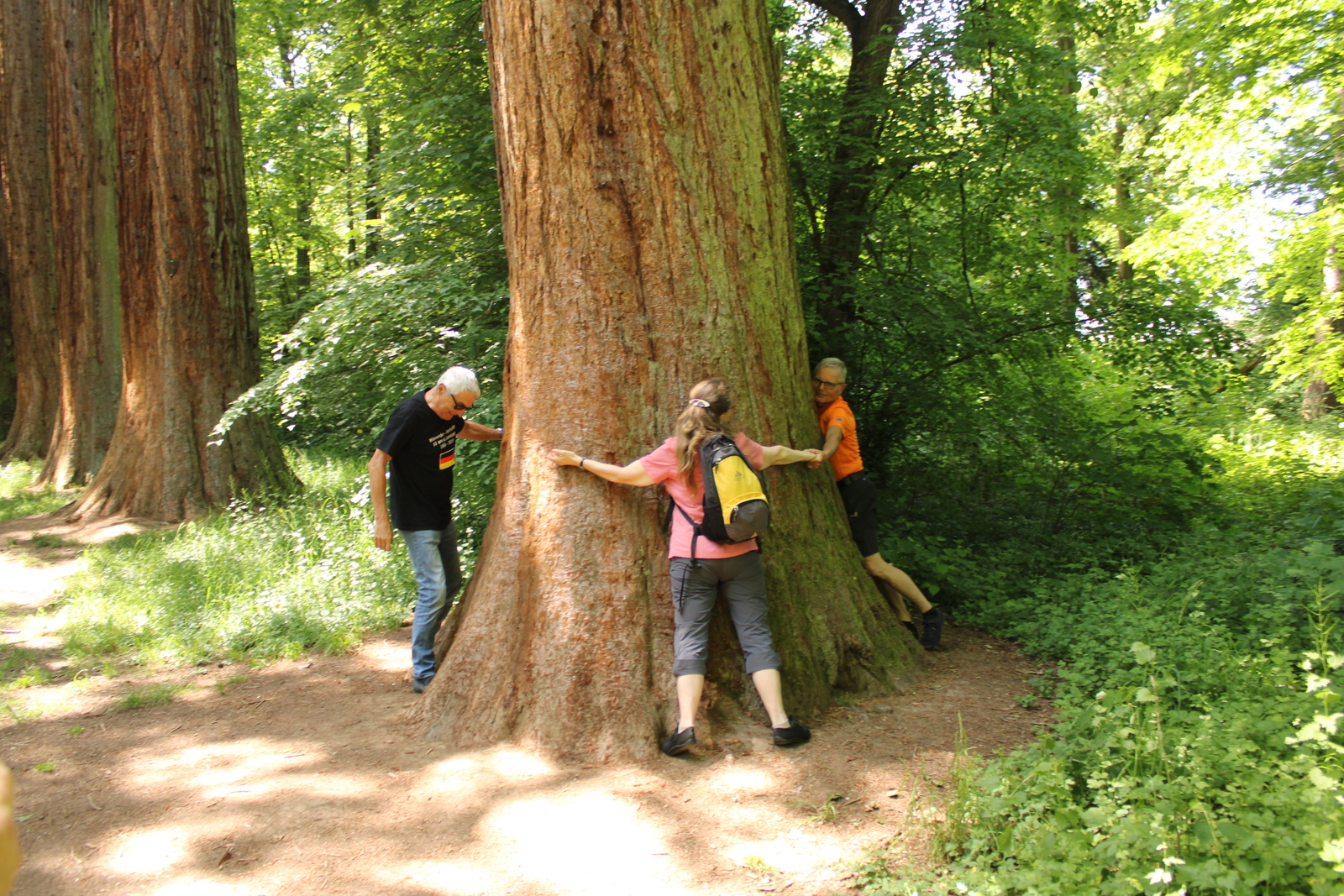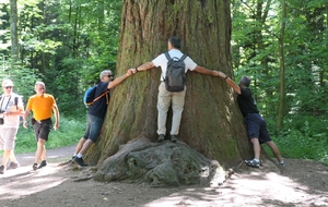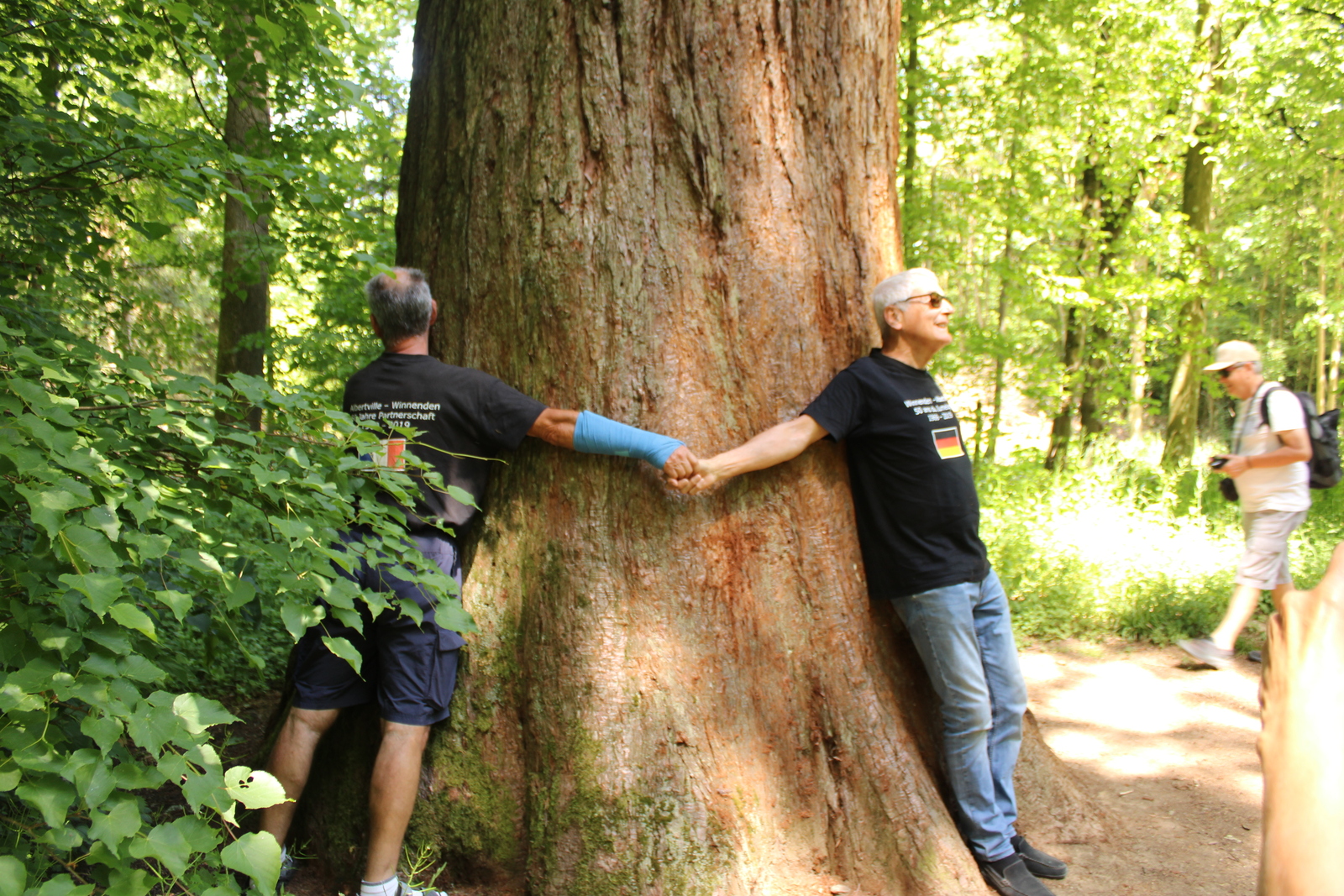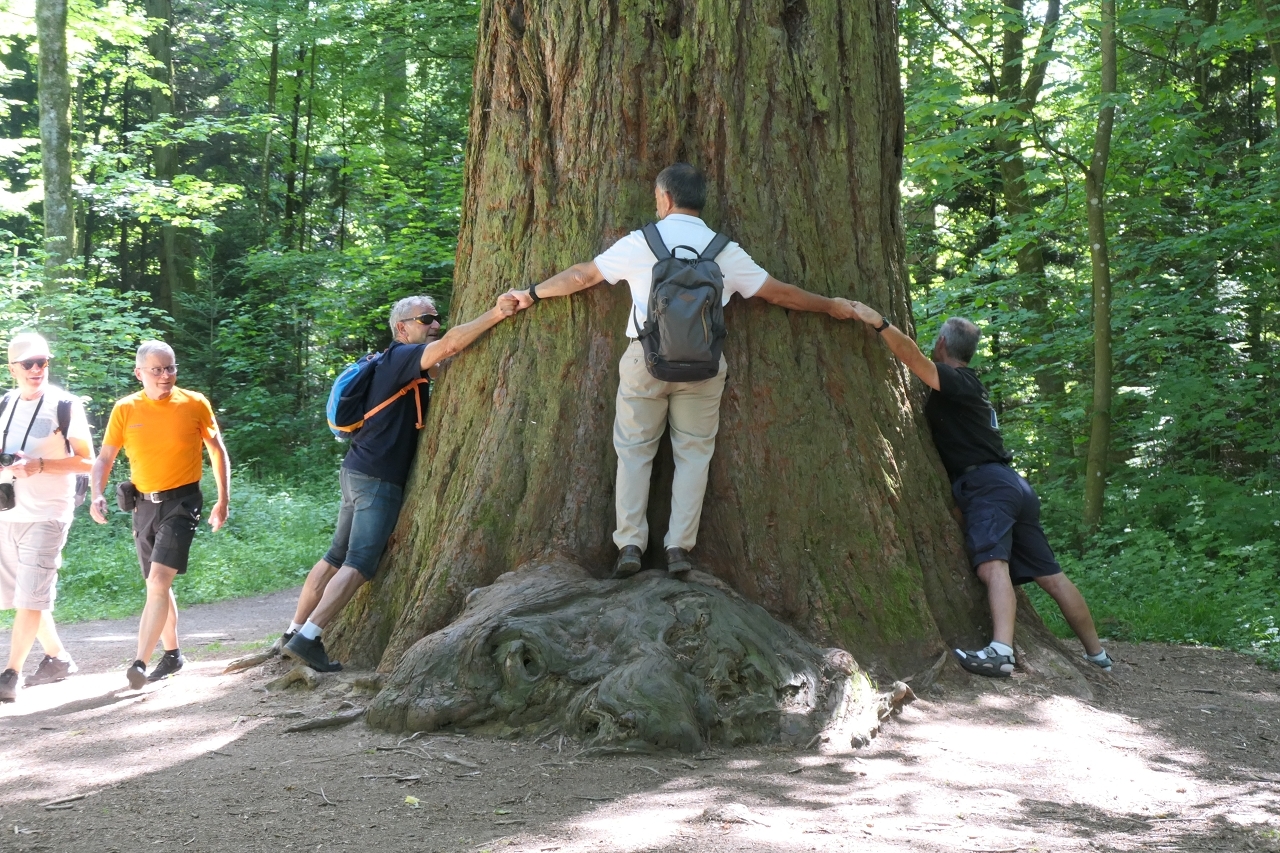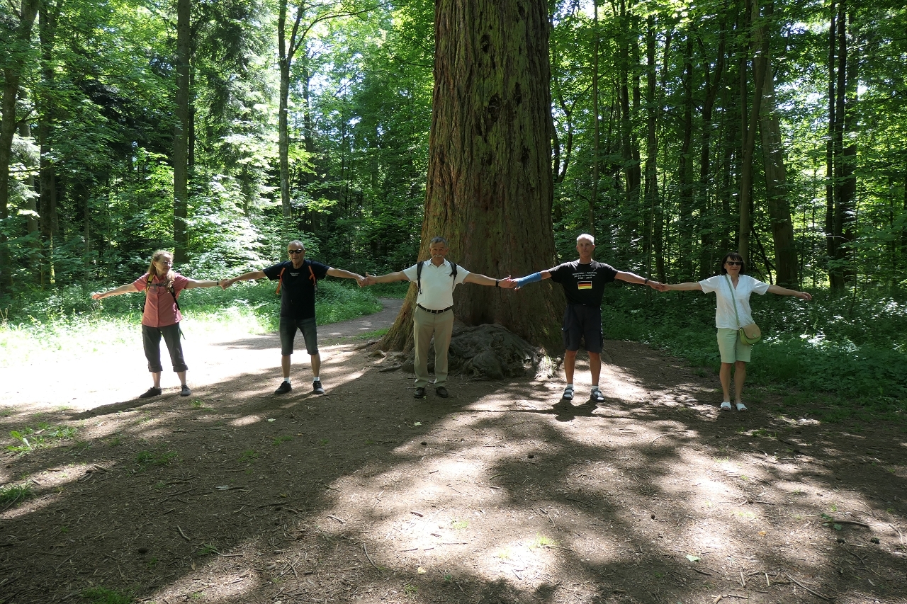 Le samedi c’est un musée privé à Eschach-Seifertshofen qui nous fait remonter dans le temps avec des voitures, des tracteurs, des avions, des véhicules militaires et même une tour Eiffel en bois et des objets de toutes les époques. Michel retrouve même le tank sur lequel il a fait son service militaire, certes en mauvais état. Nous pique-niquons sur place, avant une promenade sur le chemin du retour à Welzheim Wanderparplatz Wellingtonien. Là nous retrouvons une forêt avec des séquoias plantés en 1866 pour le roi Wilhelm 1ier (Guillaume 1ier roi de Prusse) dont le diamètre impressionnant est mesuré par 5 personnes sous le contrôle de Michel. Une petite promenade en forêt nous permet de prendre l’air sur les chemins qui conduisent à l’ancien mur maintenant détruit qui séparait l’empire romain des peuplades environnantes. Ensuite nous sommes invités pour le goûter chez Charlotte et Werner dans leur magnifique appartement au dernier étage avec une très belle vue circulaire sur Winnenden.